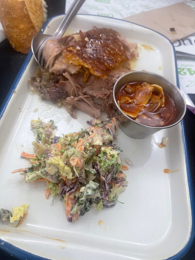 con salsa de callos al «Ajipé», ensalada de col y cerveza Tres Mares.