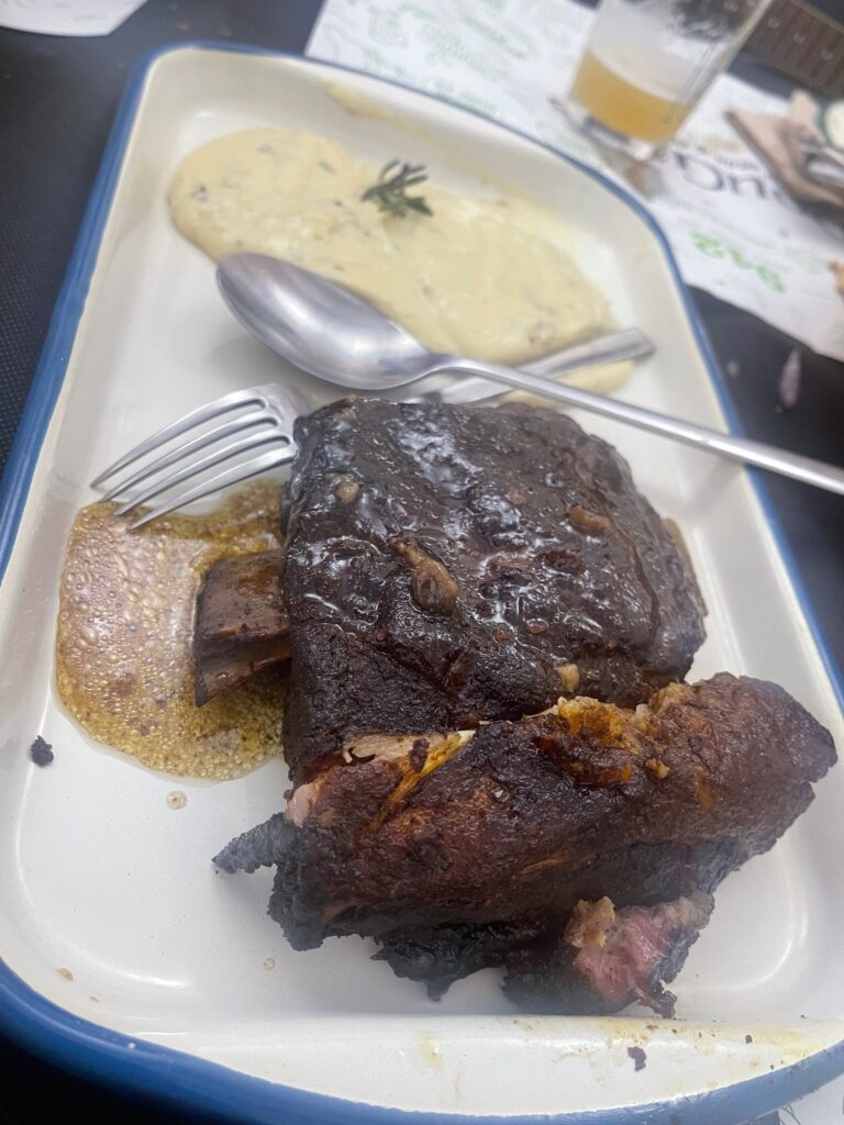 ahumada a baja temperatura con tuétano asado, cremoso de patata al romero y cerveza Fishman.